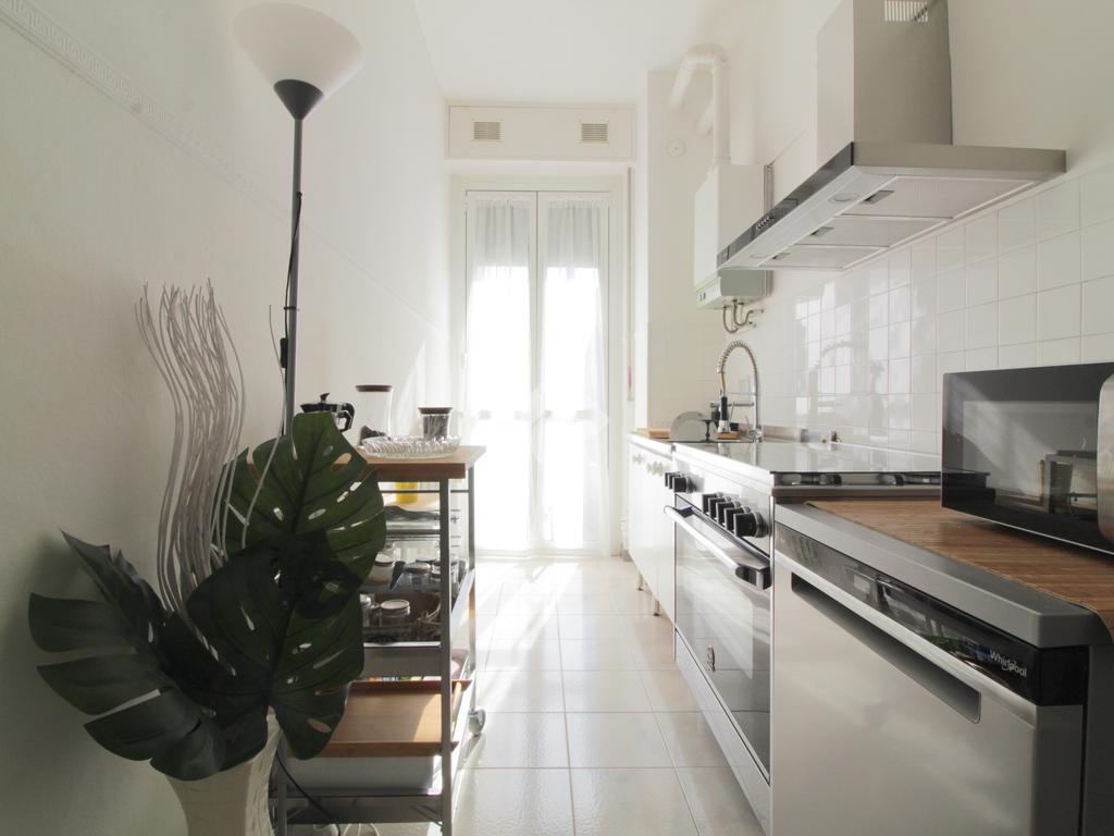 Entrando siamo accolti dalla zona giorno affacciata sull'ampio giardino condominiale: sia il soggiorno che la cucina sono infatti dotati entrambi di uscita sul primo dei due balconi.